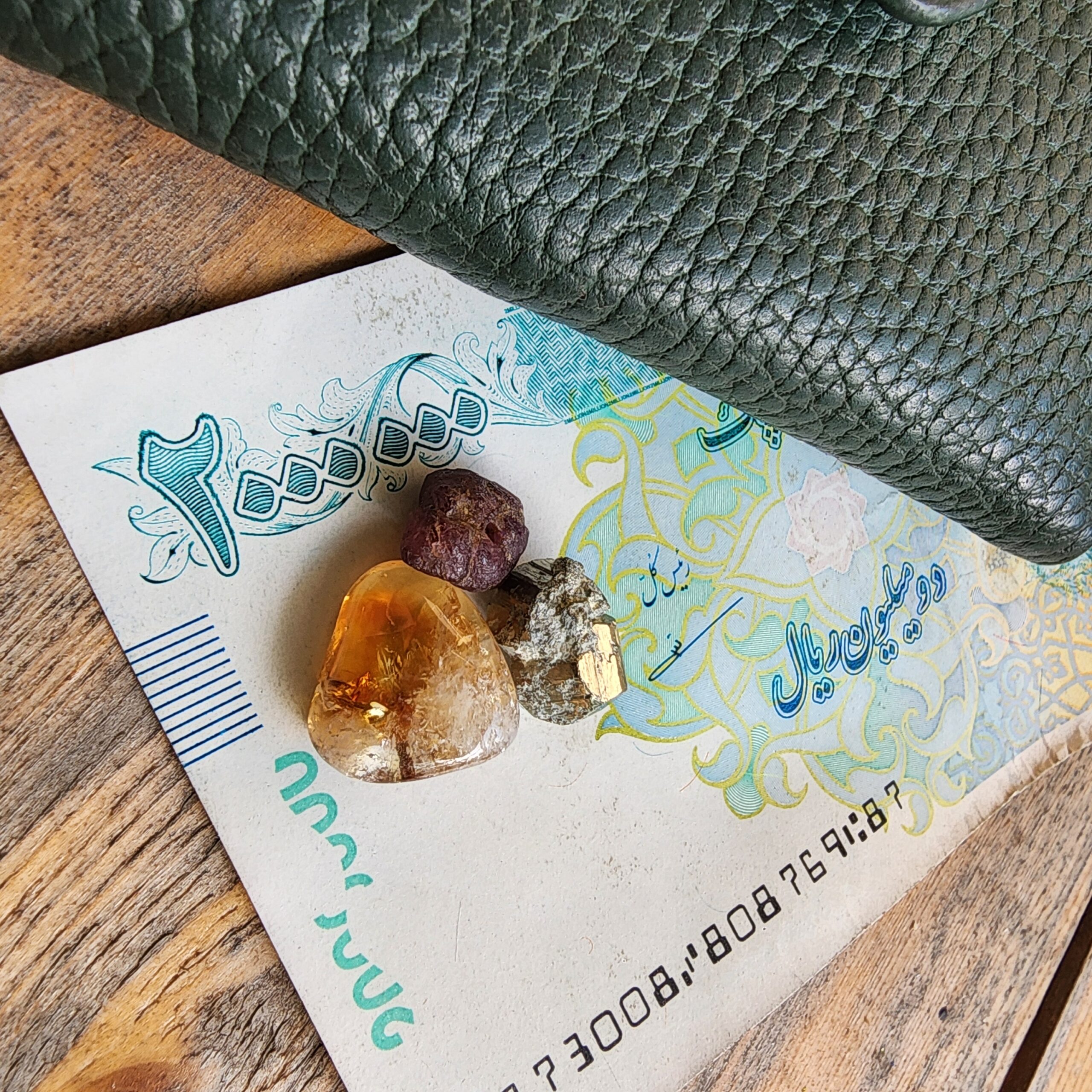 پک سنگ جذب ثروت، مخصوص قرار دادن در کیف پول، شامل پیریت، یاقوت سرخ، سیترین برزیلی و در صورت نیاز تورمالین میباشد.